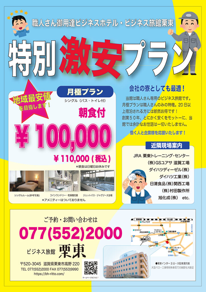 ビジネス旅館栗東 ビジネス旅館栗東は創業50年! 職人さん専門のビジネスホテルです。働く人と企業様を応援いたします! 現在新規のお客様の受け入れはお断りしております。詳しくはお電話でお問い合わせください。 また、2026年より長期滞在のみの受け入れ、朝食のみのご提供となります。 2026年版ちらしPDFダウンロードはこちらからどうぞ(1.5MB) * 大浴場は土日祝日はお休みです